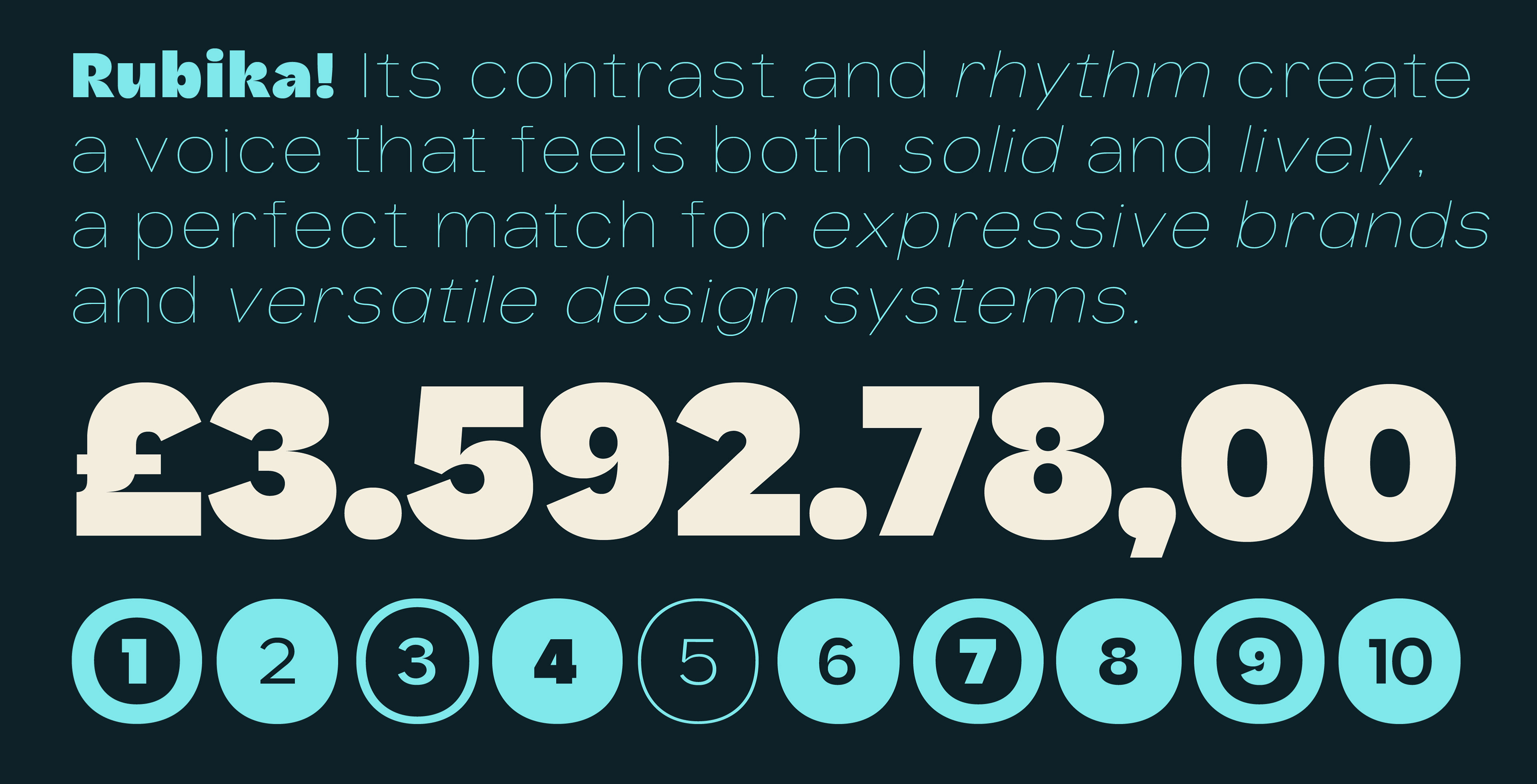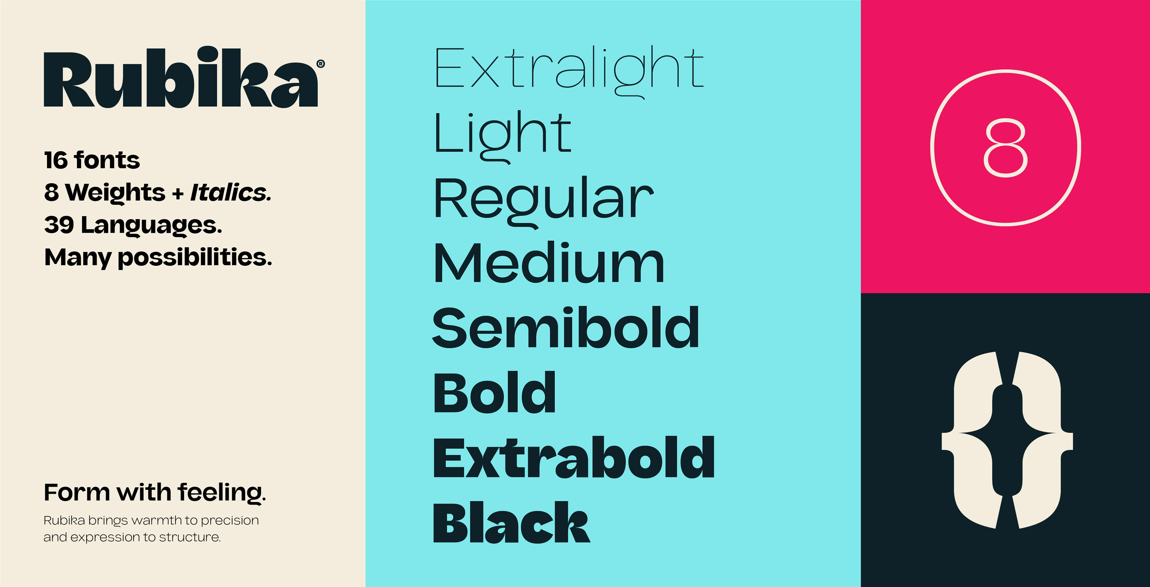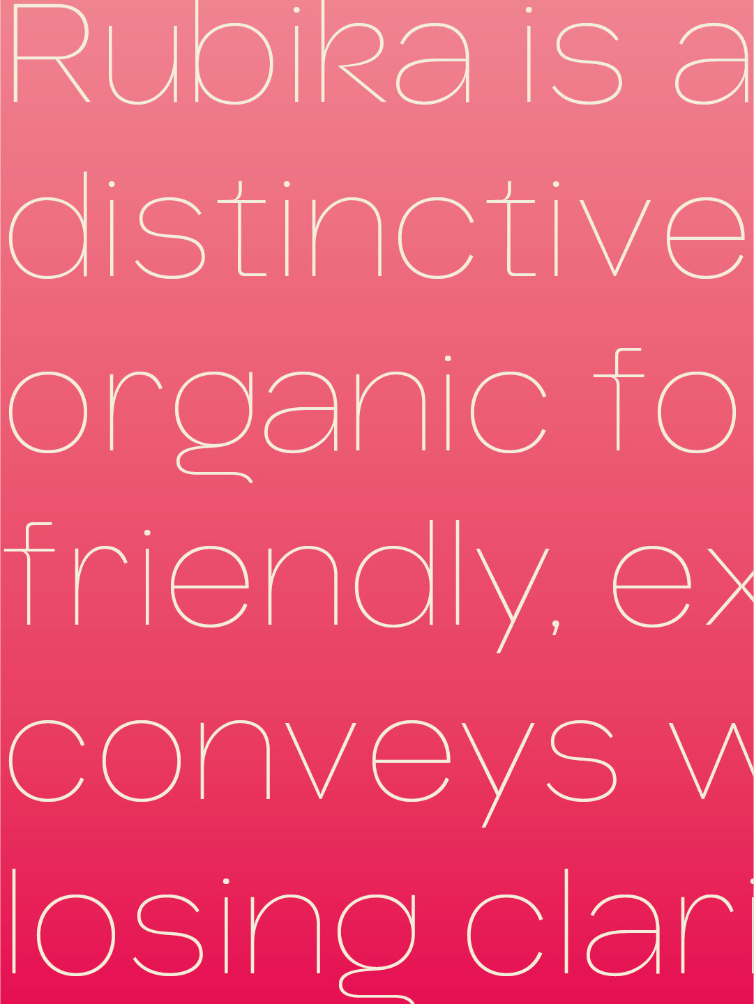Rubika is a neo-grotesque sans typeface with a distinctive personality: it blends organic shapes, sharp contrasts, and a friendly, expressive attitude. Its design conveys warmth and dynamism without sacrificing legibility or structural solidity.